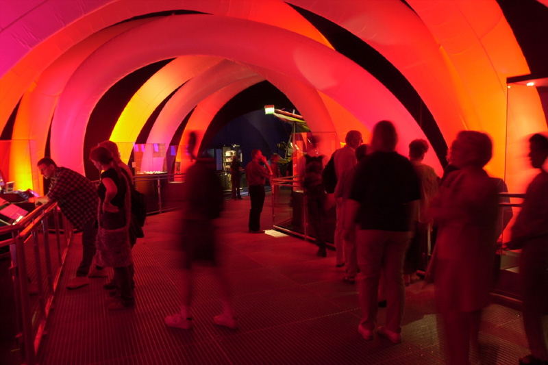 The entrance of the pavilion, a transition area, isolates the spectator from the outside ambiance. The sounds deepen, the light dims: the countdown begins…